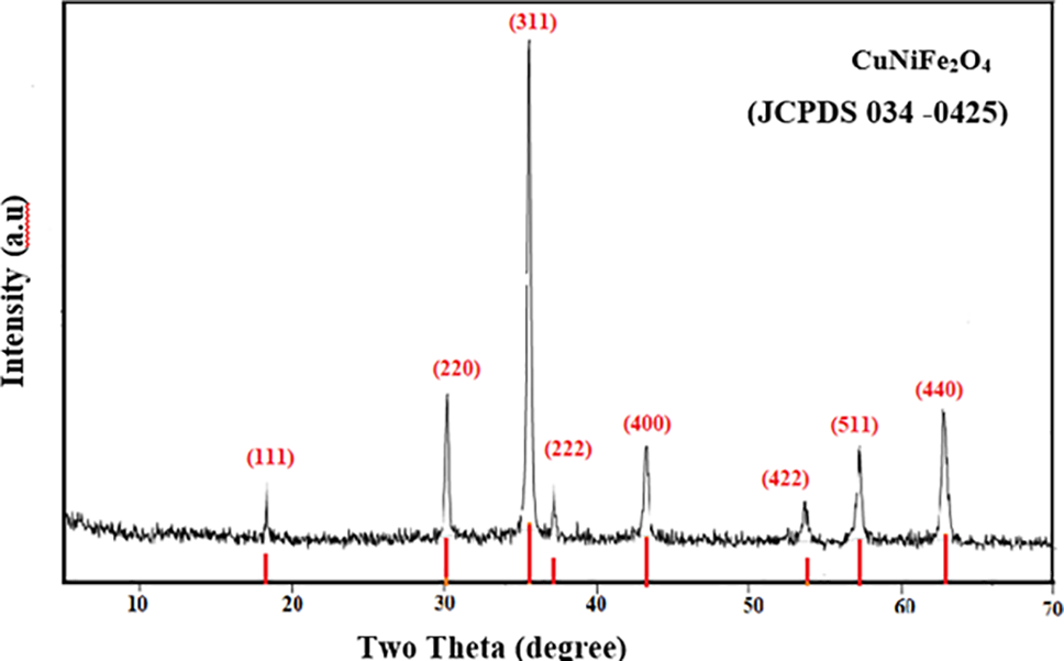 The structural analysis of the sample heated at 600 °C was done by XRD Fig. 2. The phase analysis of size controlled CuNiFe2O4 is compared with (JCPDS NO 34-0425), which shows that the major diffraction peaks at 20 values corresponding to 111, 220, 311, 222, 400, 420, 511, and 440 of pure structure miller planes are in good agreement with the standard Fe2O4. The XRD analysis results from the current study is in good agreement with the findings that have been published. Using the Debye-Scherrer equation, the crystal sizes for the X-ray spectra were determined: