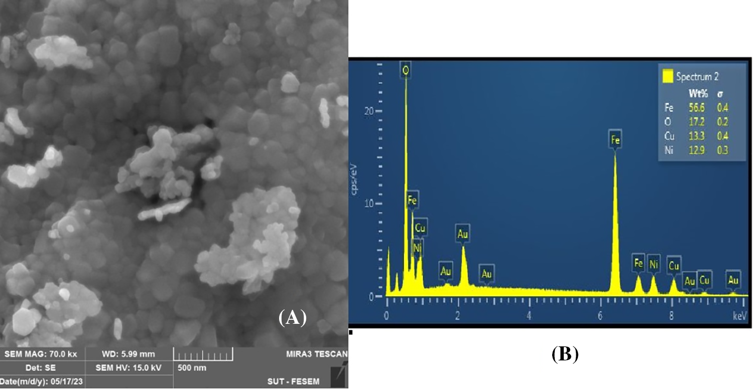 The use of (FESEM) is essential for the study of surface morphology. The CuNiFe2O4 particles appeared in the FESEM micrographs to be irregularly formed agglomerates that were tightly packed to gather. During the scanning process in this method, by interacting with the sample surface, the electron beam produces a distinct pattern that can be used for identifying surface attributes. One or more of the following steps may take place during the creation of CuNiFe2O4 particles: as a result of (a) the synthesis of CuNiFe2O4 via growth and nucleation of surface-free energy is reduced; (b) the element crystals aggregating due to the molecular attraction of distinct scale forces. Surface-free energy is reduced as a result. Aggregation results from the continual residual supersaturation that drives the formation of new crystals inside the aggregates. Subsequently, the agglomerated particles combine with more particles to form secondary particles, which grow in size. This agglomerated particle aggregates to generate secondary particles, which is how the particle size increases. The presence of Cu and Ni in the samples was confirmed by EDX data, indicating that the procedure used to manufacture CuNiFe2O4 was appropriate. CuNiFe2O4 with a pure crystal structure was confirmed by XRD, FTIR, and EDX investigation. Fig. 3 shows the EDX photos for Cu, Ni, Fe, and O.