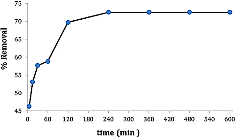 At a constant temperature of 25 °C, the impact of contact time on the CR dye adsorption was investigated throughout a range of periods (5–600 min). Fig. 4 illustrates how extending the contact time until equilibrium results in an increase in the elimination percentage of CR dye. The large adsorption surface area that is appropriate for the attachment of the CR dye is the reason why the initial adsorption amount was essential. Lastly, equilibrium is stabilized, and the adsorption rate is slower, most likely as a result of active site saturation [28], [29]. The equilibrium time was found to be a duration of 240 min, and 72.5% of the dye was removed.