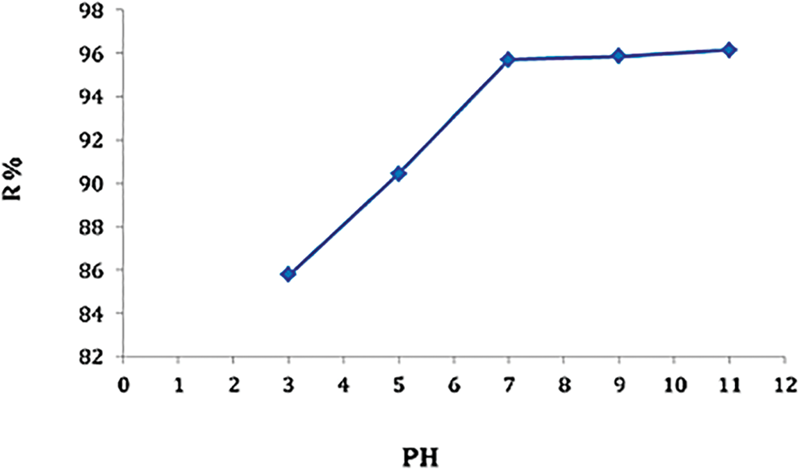 pH is one of the main factors affecting the dye’s adsorption onto the adsorbent. The impact of pH on CR dye adsorption onto CuNiFe2O4 nanoparticles at different pH (3-11) was investigated using an initial concentration of 50 mg/l, a contact time of 240 min, and an amount of nanoparticle adsorbent of 0.2 g at 25 °C (Fig. 8). The findings demonstrated that when pH accelerates between 3 and 11 (see Fig. 5), the removal percentage of CR decreases from 85% to 20%. At acidic mediums (low pH), the active sites acquire a positive charge, so at pH3, the positively charged surface of CuNiFe2O4 and the negatively charged anionic CR dye exhibit a notably strong electrostatic interaction. The number of positively charged sites reduced as the system’s pH increased, which in turn caused the adsorption capacity in the base medium to decrease [30].