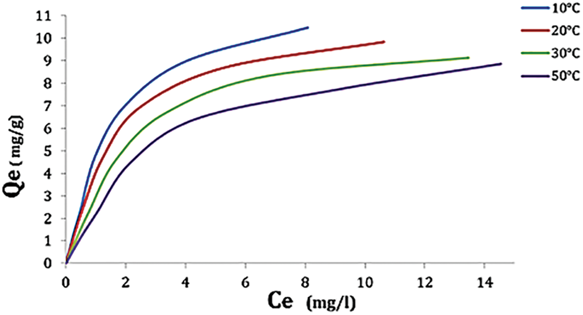 An array of temperatures, 10 °C, 20 °C, 30 °C, and 50 °C, was chosen to evaluate the ability of CuNiFe2O4 nanoparticles to extract CR dye from their aqueous solution. Fig. 6 shows the general shape of the dye adsorption isotherms, with the amounts adsorbed displayed as a function of equilibrium concentration (Ce) at 10 °C, 20 °C, 30 °C, and 50 °C on nanoparticles CuNiFe2O4 (Qe).