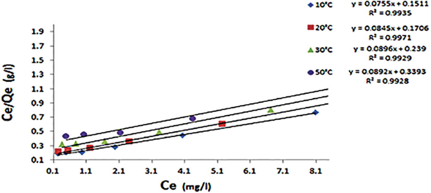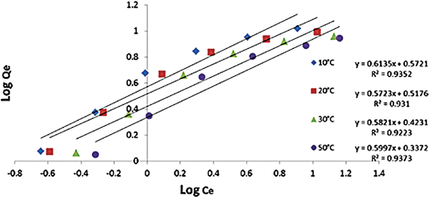 The form of the CR dye adsorption isotherm on CuNiFe2O4 is in accordance with the Giles categorization (s-type). As the molten layer is actually adsorbed, where additional quantities are set, the s-curve shows that the flat or vertical orientation of the molecules in the adsorbent layer have a significant attraction to one another [31]. The Freundlich and Langmuir isotherm was used in practice to apply the adsorption results. To track the effect, Freundlich’s Eq. (7) and Langmuir’s Eq. (8) were applied [32], and Table I displays the isotherm adsorption data: