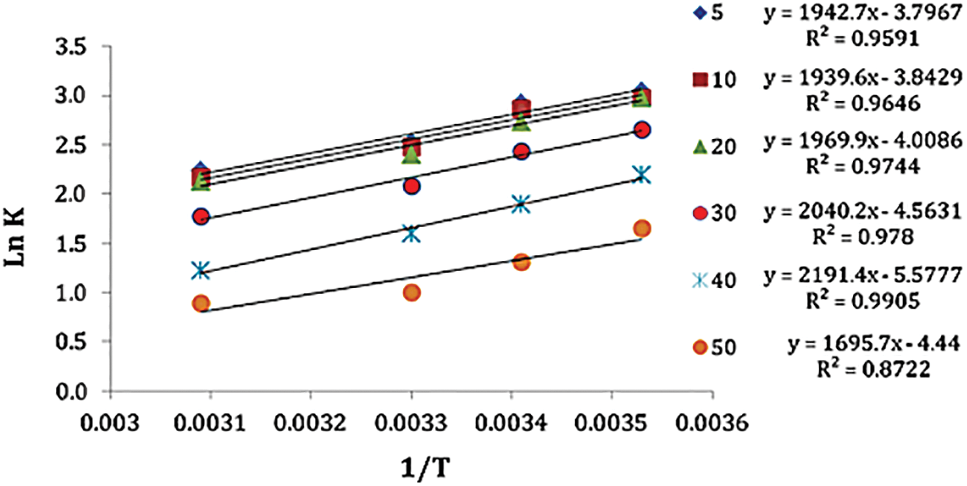 It was discovered that the lnk against 1/T plots were linear, and the adsorption on CuNiFe2O4 nanoparticles had a correlation coefficient (R2 = 6.8722–0.9905) (Fig. 9). Table II demonstrates that ΔG was negative across the board, suggesting that the adsorption process occurs spontaneously [34]. The adsorption process is exothermic, as indicated by the negative value of ΔH, and the solid-solution interface is thought to be less disorderly and unpredictable when ΔS is negative [35].