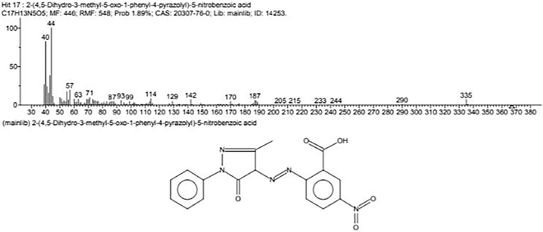 Fig. 1. Mass spectrum of 2-(4,5-Dihydro-3-methyl-5-oxo-1-phenyl-4-pyrazolyl)-5-nitrobenzoic acid.