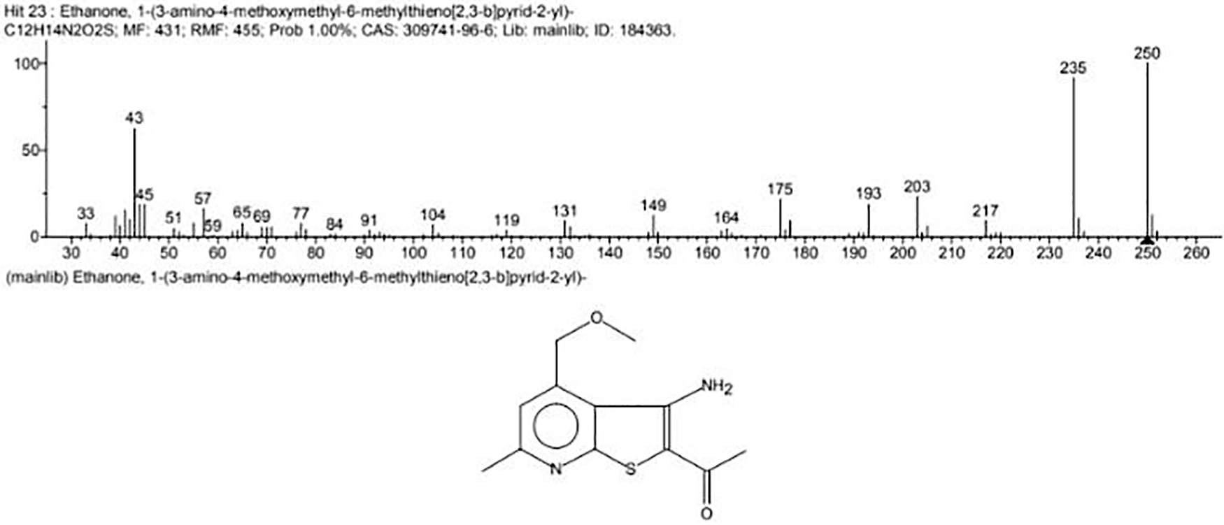 Fig. 2. Mass spectrum of ethanone, 1-(3-amino-4-methoxymethyl-6-methylthieno[2,3-b] pyrid-2-yl).