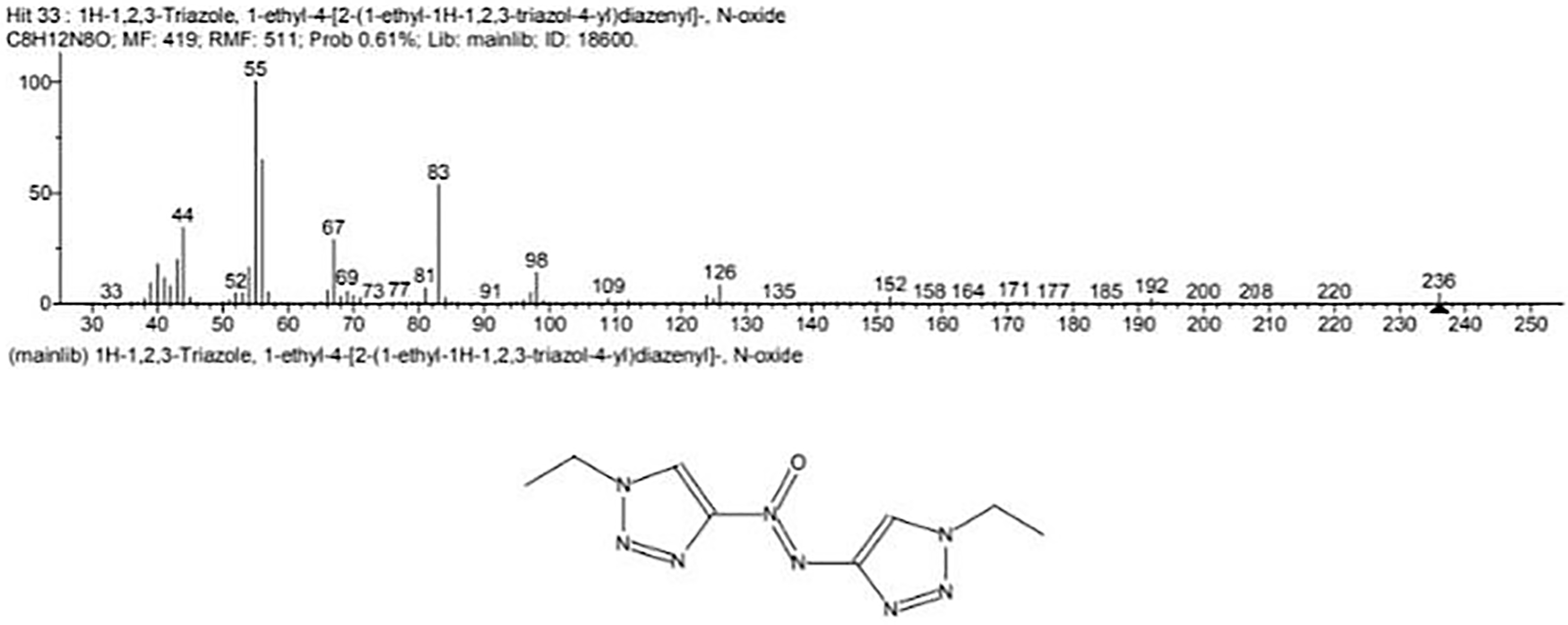Fig. 3. Mass spectrum of 1H-1,2,3-Triazole, 1-ethyl-4-[2-(1-ethyl-1H-1,2,3-triazol-4yl)diazenyl]-N-oxide.