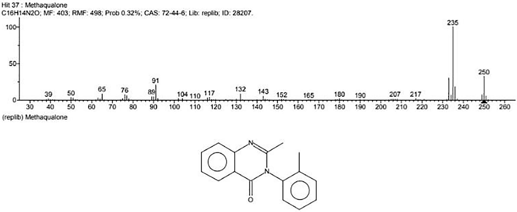 To separate and characterize the alkaloidic compounds existing in the alkaloidic extract, gas chromatography- mass spectroscopy technique was carried out successfully to determine of number of alkaloidic compounds and identification their fine chemical structures. It was found the alkaloidic compounds are 2-(4,5-dihydro-3-methyl-5-oxo-1-phenyl-4-pyrazolyl)-5-nitro benzoic acid, ethanone, 1-(3-amino-4-methoxy methyl-6-methylthieno[2,3-b] pyrid-2-yl), 1H-1,2,3-triazole, 1-ethyl-4-[2-(1-ethyl-1H-1,2,3-triazole-4-yl)diozenyl]-,N-oxide, methaqualone, propanoic acid, 3-(perhydro-2,5-dioxo-imidazol[4,5-d] imidazol-1-yl) and benzimidazole-5-carboxylic acid, 2-methyl-1-phenyl. Mass spectra for these alkaloidic compounds were recorded as shown in Figs. 1–6.