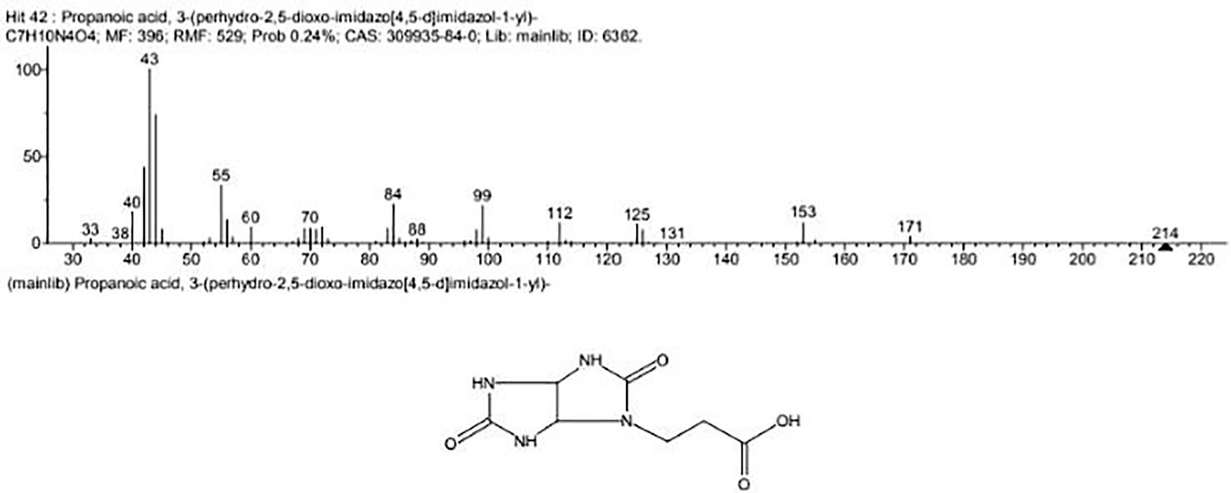 Fig. 5. Mass spectrum of propanoic acid, 3-(perhydro-2,5-dioxo-imidazo[4,5-d]imidazol-1-yl).