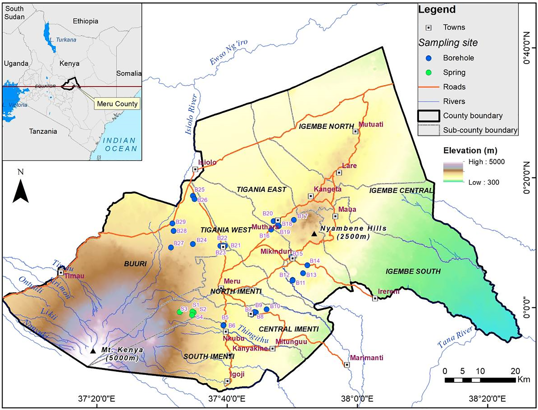 A total of four (S1-S4) springs and twenty-five (B5-B29) boreholes were investigated. The sampling sites are bound by latitudes of −0.004657 and 0.286540, and longitudes of 37.522705 and 37.871757. The County is divided into 11 sub-counties, which are Imenti South, Imenti Central, Imenti North, Buuri East/West, Tigania East/Central, Igembe South, Igembe Central, and Igembe North. The area covers approximately 7,006.3 km2 with a total human population of 1,544, 866 according to the 2019 Kenya population and housing census [26]. This represented approximately 3.2% of the Kenyan population, which was 47,564,296. The geology of the area is almost entirely volcanic, dominated by basaltic rocks along with trachytes, phonolites, and kenytes [27]. Mt. Kenya and the Nyambene Range are key water towers in the region. Most dry areas in the county rely on groundwater abstraction by both hand-dug and drilled wells.
