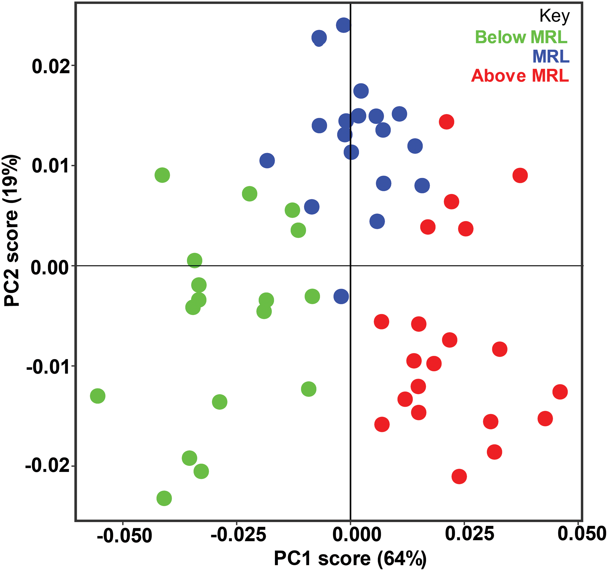 Fig. 5. PCA scores plot showing the precise discrimination of below MRL, MRL, and above MRL samples using the fingerprint (314–354 cm−1band).