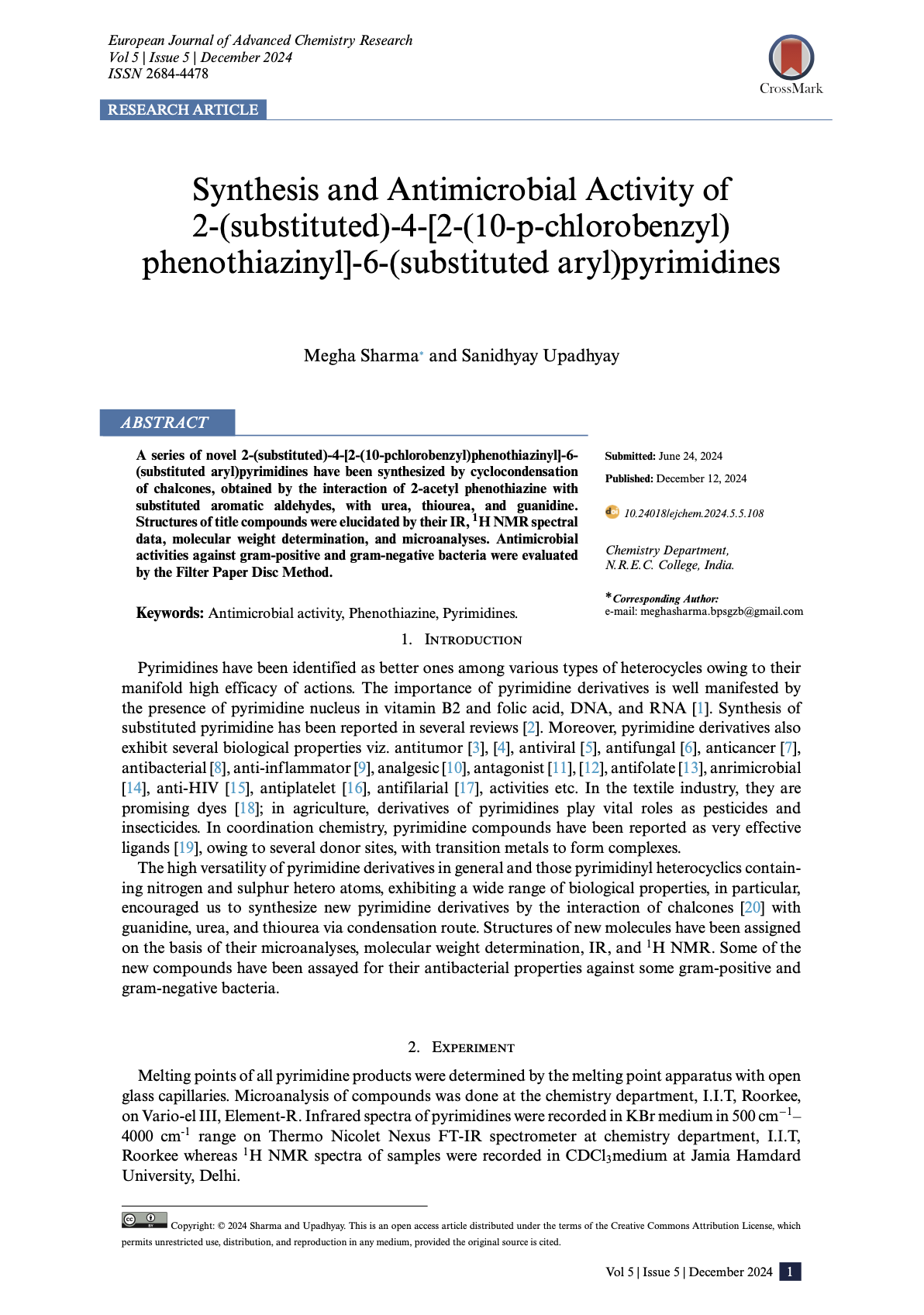 Chalcones synthesized earlier from this laboratory [20] have been used as starting materials for the synthesis of substituted phenothiazinyl pyrimidines.