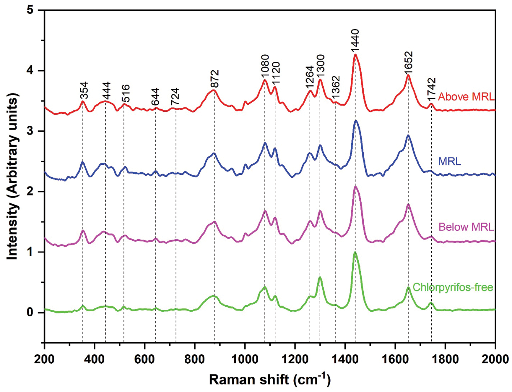 Fig. 1 shows the average Raman spectra for the control sample and milk spiked with chlorpyrifos at three levels: below the MRL (0.003 ppm), at the MRL (0.01 ppm), and above the MRL (0.03 ppm). Notably, the spectra of the control and low-concentration groups were visually similar in terms of overall band structure and relative intensities. Across all the samples, Raman bands were observed within the spectral range of 354–1742 cm−1. This overlap limits the visual discrimination between groups and highlights the need for multivariate statistical analyses.