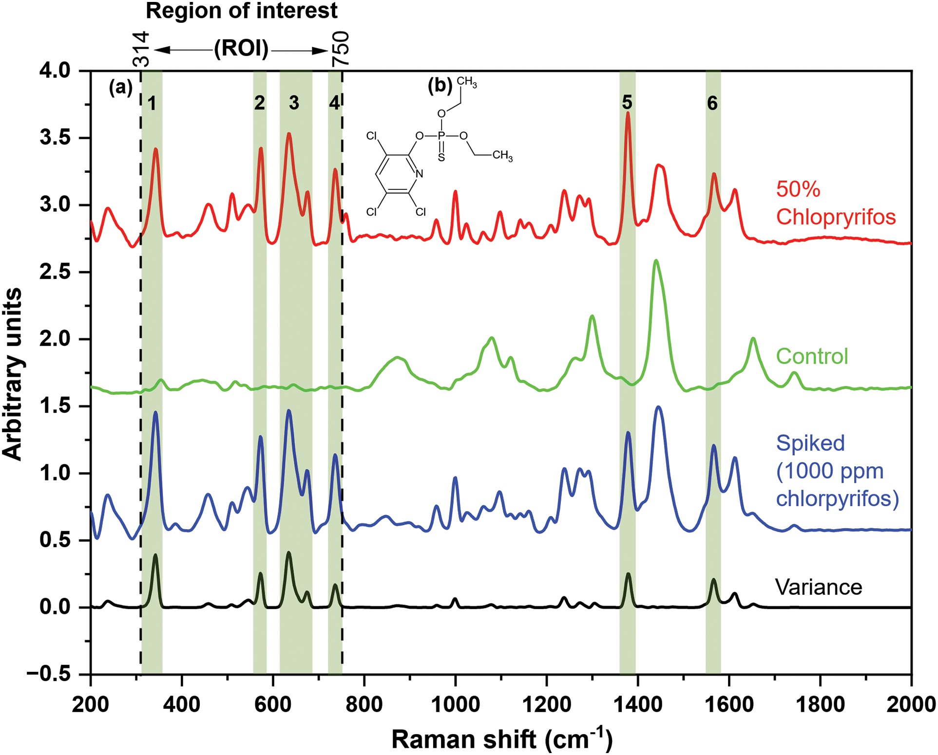 Bands with variance above a 30% threshold were considered significant and are marked as striped regions 1–6 in Fig. 2a. Centered at 342, 572, 634, 736, 1378, and 1568 cm−1, these bands showed substantial differences between the control and chlorpyrifos-treated samples, making them potential chlorpyrifos marker bands. To ensure that these spectral features corresponded to chlorpyrifos rather than the inactive ingredients in the commercial pesticide, we cross-referenced them with previously reported Raman studies. The alignment of these bands with the established literature values supports their reliability as characteristic chlorpyrifos signatures.