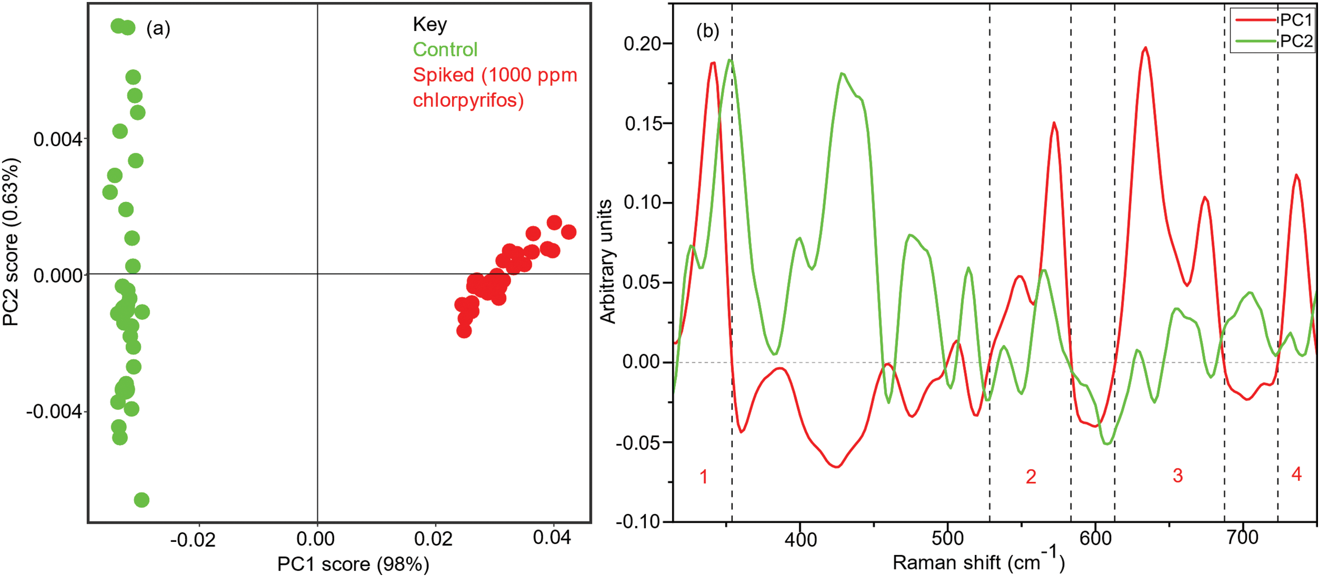 Fig. 3. (a) PCA scores plot and (b) loadings plot for control milk and milk spiked with 1000 ppm chlorpyrifos, based on the ROI (314–750 cm−1).