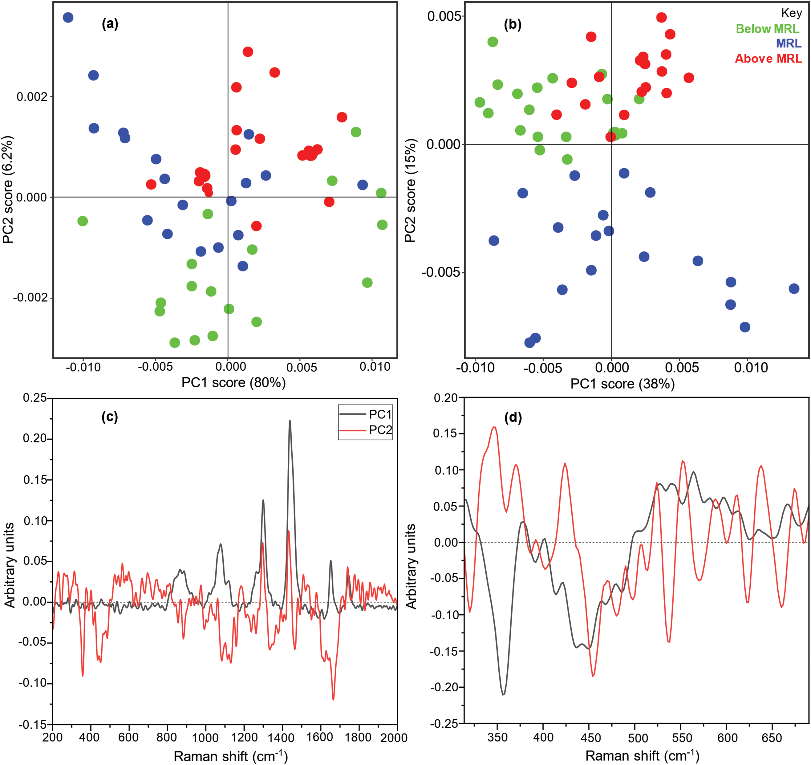 Fig. 5. PCA scores plot showing the precise discrimination of below MRL, MRL, and above MRL samples using the fingerprint (314–354 cm−1band).
