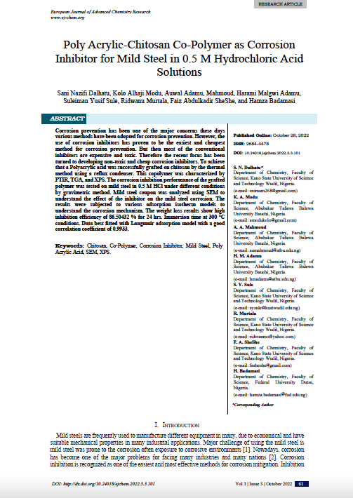 Poly Acrylic-Chitosan Co-Polymer as Corrosion Inhibitor for Mild Steel in 0.5 M Hydrochloric Acid Solutions